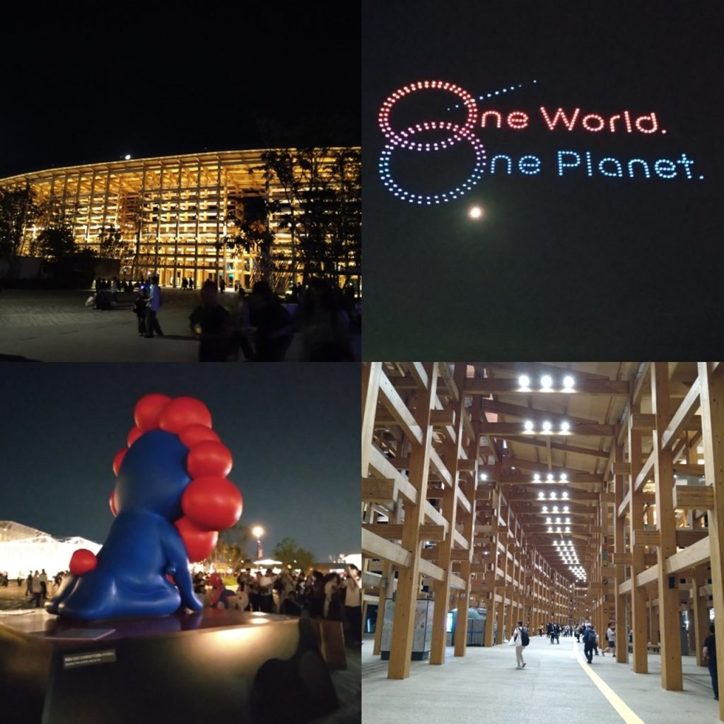 大会の後、とっぷり暮れた万博会場をぶらり歩きました。夜風が心地よく、ドローンショーも偶然始まり、ラッキーでした。