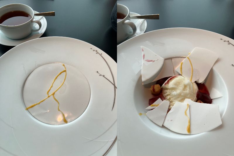 デザートの名前は”金継ぎ”。見た目その通りです。金で継がれたようなホワイトチョコレートを割り入れると中から ラ・フランスのソルベ ムースが!旬のフルーツ、梨のワイン煮とともに上品な味わいを楽しみました。この日のシグニチャー4品ランチコースは9,500円(税・サ込み)