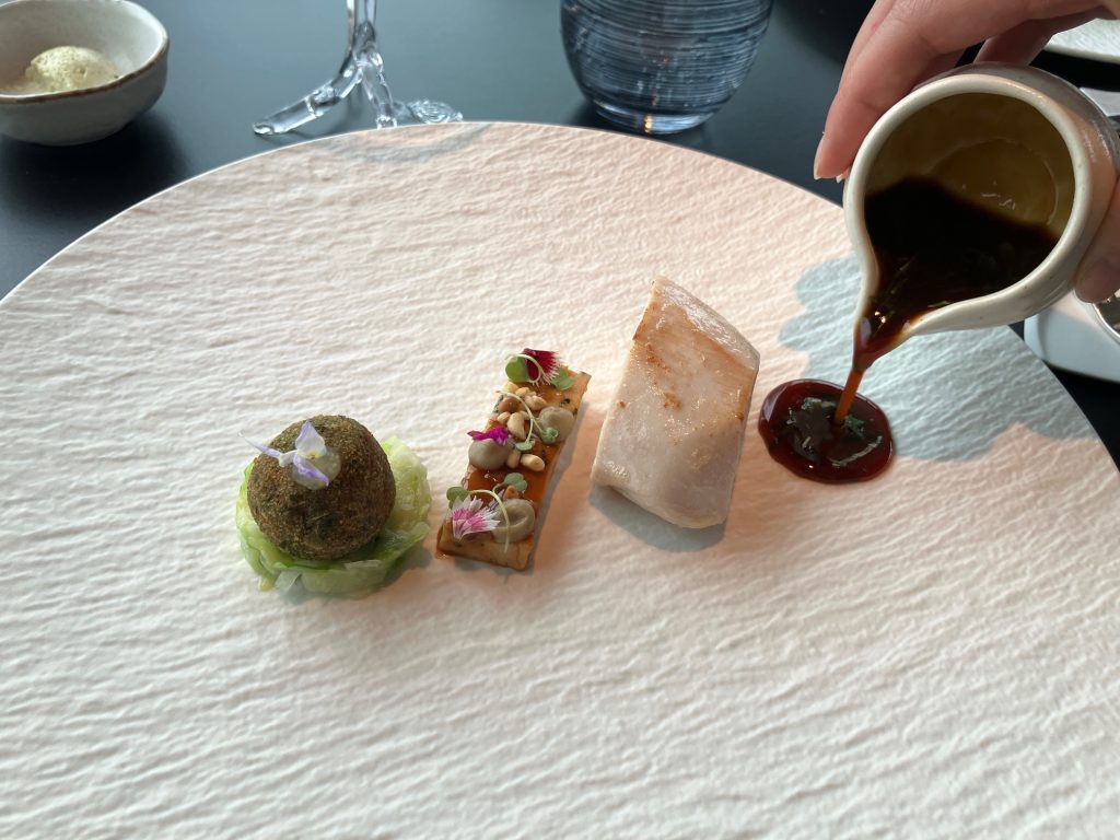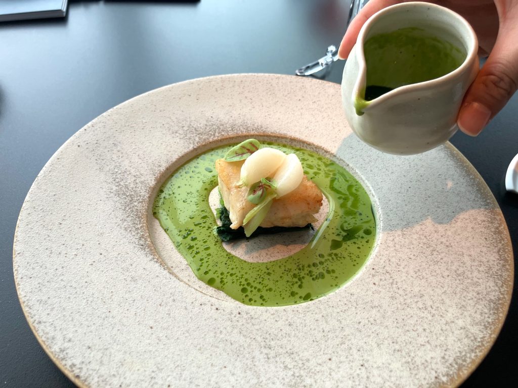 2皿目は、魚料理。上品な淡白さに旬で旨味が増したハタにクレソンを使ったソースが見た目も美しくヘルシー。奥深さと軽やかさのハーモニーを味わいました。
