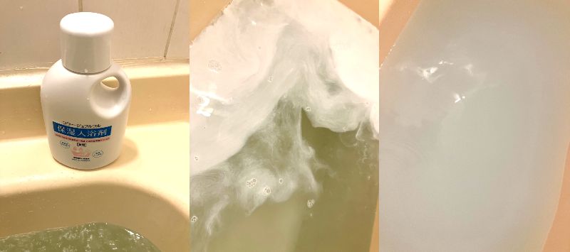 「コラージュフルフル 保湿入浴剤」は、浴槽の湯(約180~200L)にキャップの内側の線まで(約20~30ml)の液を入れ、よくかき混ぜるだけ。ほんのり白濁した湯は、ベタつきやとろり感ではなく、しっとり肌を包み込むようで、潤いを感じました。肌が滑らかになるようで、ちょっと美容液の湯につかるような感じがしました。