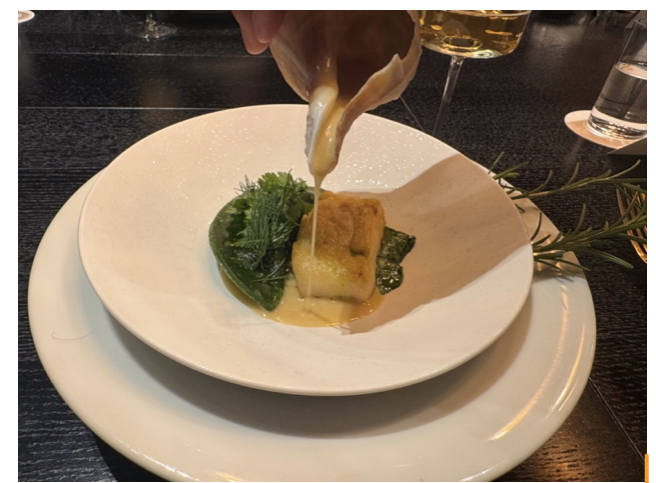 メインの魚料理は、寒鮃のソテー 柑橘とハーブの芳香です。野菜をふんだんに使用しており、塩分を控えめにしてあるので、フレンチは重たい印象がありますが、隈元シェフの料理はとても軽く、年配の方にもファンが多いフレンチです。寒鮃は表面を香ばしくソテーし、ハーブと柑橘類をブレンドしたアンフュージョンの演出です。繊細な白身の甘みを、柑橘とハーブの芳香がやさしく引き立て、添えた“ほうれん草生地のラビオリ”にはムール貝とアーモンドを包み、海の旨みと香ばしい食感で一皿に奥行きがあります。ハーブの香りがとても爽やかで、今回合わせたモクテルのペアリングにもぴったりです。