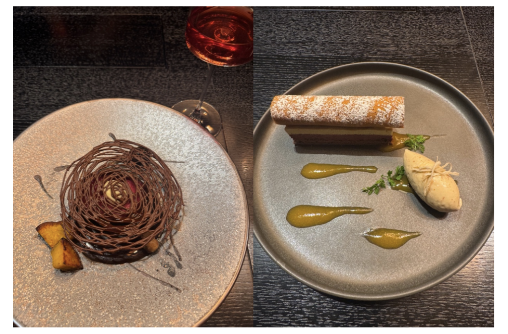 メインの肉料理(写真左)は、蝦夷鹿のロースト。ジビエはシェフの得意な料理の一つ。とても丁寧な下処理を施した蝦夷鹿を、外は香ばしく中はしっとりと最適な火入れでローストしています。癖を感じさせず、野趣と旨味を引き出しています。ジビエが苦手な方も、隈元シェフのジビエを食べると考えが変わるそう。カカオ香るクロッカンで“大地”を表現し、蝦夷鹿のローストと根菜を重ねており、見た目の楽しい一皿です。