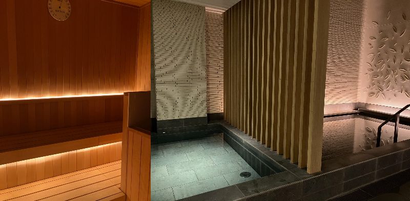 「ノゾホテル」の館内施設には、サウナと水風呂、人工ラドン温泉の内風呂と露天風呂を備えた「Sugi Spa」があります。とても内風呂は天井が高く、光が注いで幻想的で癒されます。本格的なサウナときりっと冷えた水風呂で温冷浴も。ひとり旅だと気の向くまま、私は5分サウナで水風呂&お風呂を2セット。すごくすっきりするのが実感できます。
