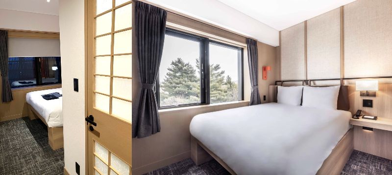 夜は、客室に戻ってそのままバタン。15㎡のスーペリアクイーンは、ナチュラルなインテリアにクローゼットやデスクがうまく配されていてベッド周りはゆったりしてます。バスルームのドアが障子風なのが、外国から見た日本のようでおしゃれ。
