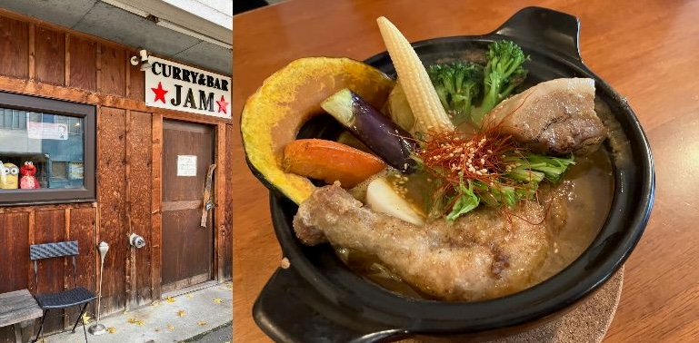 北海道名物のスープカレー。この「カレー&バー ジャム」のカレーは、もう一目瞭然のボリュームと玉ねぎを何時間も炒めて煮込んだスパイシーなスープの味わい深さは、富良野の忘れられない思い出になります。