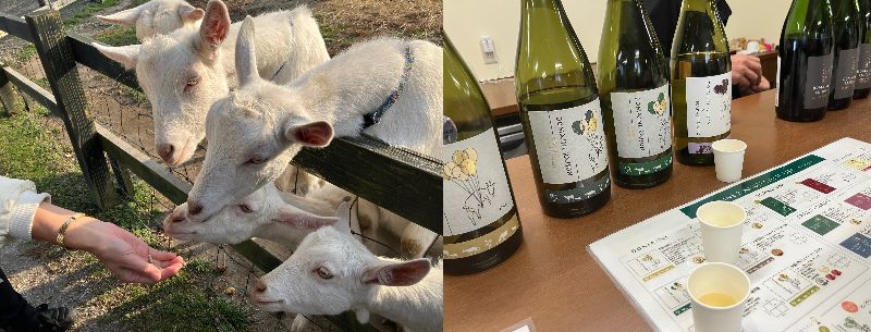 人間と自然が共存できる環境でのワイン造りを目指す「ドメーヌ・レゾン」では、飼育しているヤギが草を食べ、その排泄物を堆肥にして土に戻した畑でワインのブドウを作っています。ヤギにえさをあげたり、試飲してじっくりワイン選びもできるワイナリーです。ノゾホテルから車で約10分。