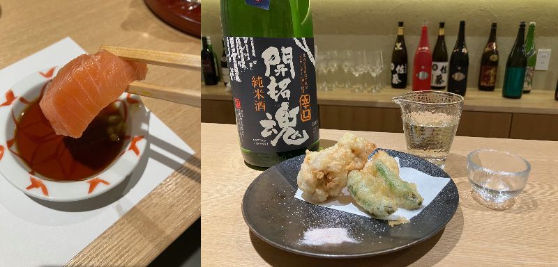 JR富良野駅から程近い一軒家の日本料理店は、北海道の海鮮とお酒を楽しむならココとノゾホテル総支配人のおすすめ。白木のカウンターでとびきり新鮮なお刺身や〆には寿司も。写真右は北海道日高産のブランド鮭「銀聖」の刺身と左は真だらの白子天ぷら。北海道のものと全国からの選りすぐりのお酒が揃っています。ノゾホテルから車で約8分、JR富良野駅から徒歩約3分。