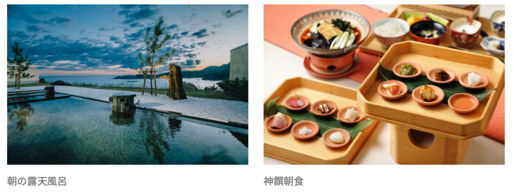 「界 出雲」の泉質は、海水のような塩分を多く含む強塩温泉 。神様が海で身を清めた神話の「禊(みそぎ)」にちなみ、出雲大社への参拝前に「禊湯(みそぎゆ)」として入浴することで、心身を清めます 。 朝食では、プラン限定の「神饌(しんせん)朝食」が提供されます。神様へ献上する「神饌」から着想を得た食事でご縁を結び、参拝への準備を整えます 。
