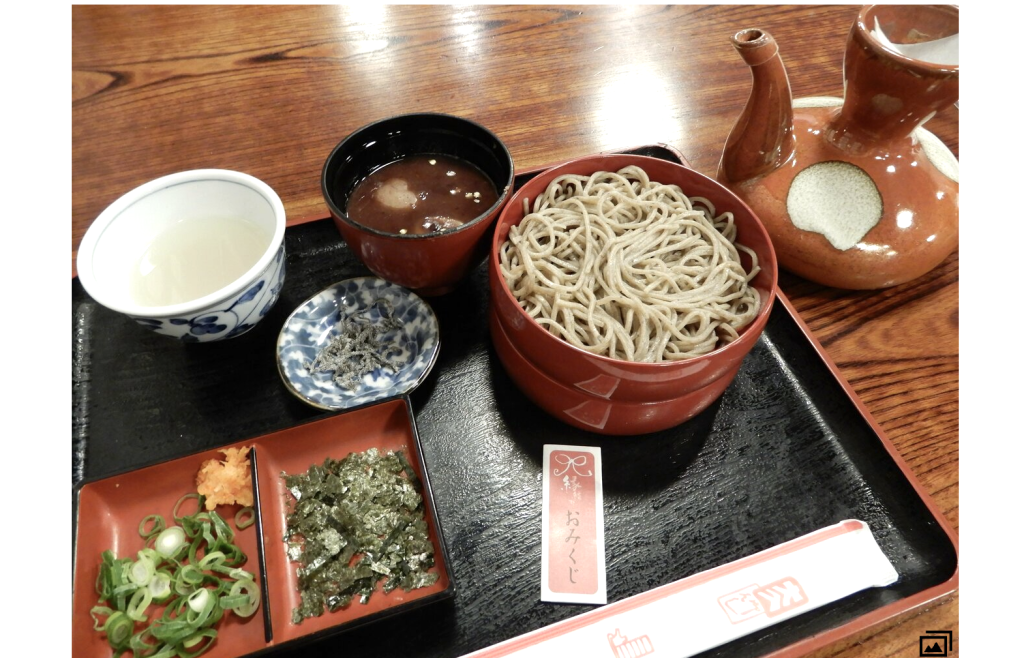 さて、編集部のおすすめは、出雲大社近くの「開運グルメ」とも言えるのがおそば「荒木屋」さんの「縁結びセット」。のり、ネギ、もみじおろしなどの薬味をのせておだしをかけて食べる「割子そば」2段に特製そばぜんざいのセットにおみくじが付いて「1,130縁」とご縁もお財布も嬉しいセットです。おいしいおそばと出雲が発祥と言われるぜんざい、そして運試しのおみくじには開運アドバイスも。一石三鳥のセットです。