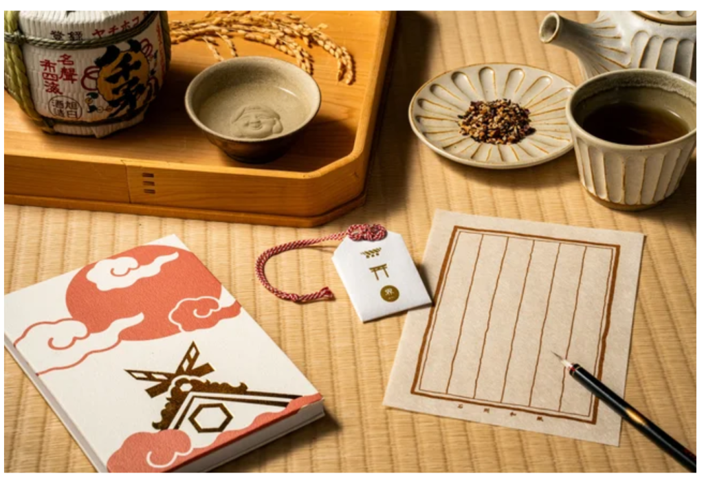 モデルスケジュールの1日目。客室に用意されているのは、出雲大社への参拝準備を整える「お詣り支度セット」。内容は出雲大社の御神酒「八千矛(やちほこ)」、オリジナル御朱印帳、かみまもり、そして石州和紙の「願い和紙」も。到着後にまず御神酒で心身を清め、「願い和紙」に願い事を記します 。厄除けとして伝わる小豆の開運茶をお供に、願いを込めた和紙を「かみまもり」に納め、心願成就を祈る参拝に備えます.