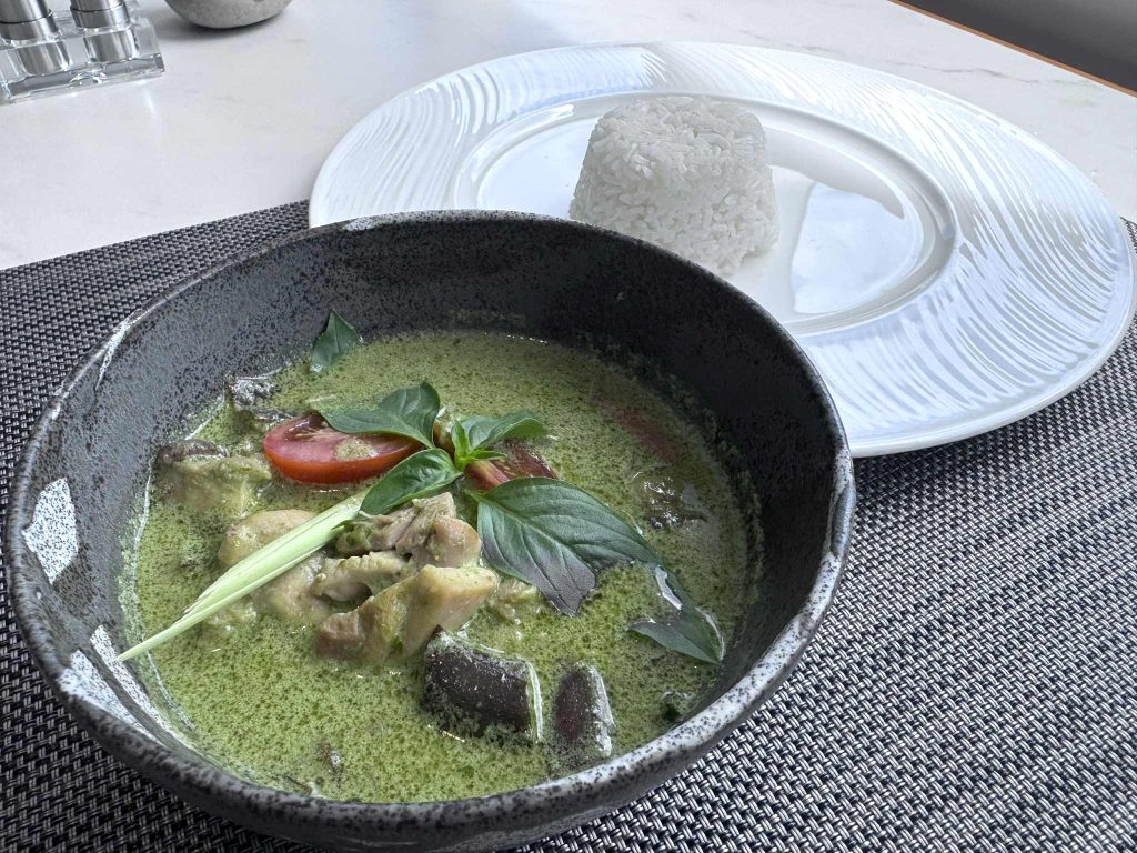 1日のアクティビティを終えてひと息つくと、ちょうど夕焼けの美しい時間。ワインを頼んで、黄昏時を楽しみます。ある日の夕食のコース料理は、タロ芋のスープの前菜からスタート。パパイヤサラダ・クラブケーキなどに続き、メインはポークグリル。皮目がパリッと焼けていて、とても美味しいです。