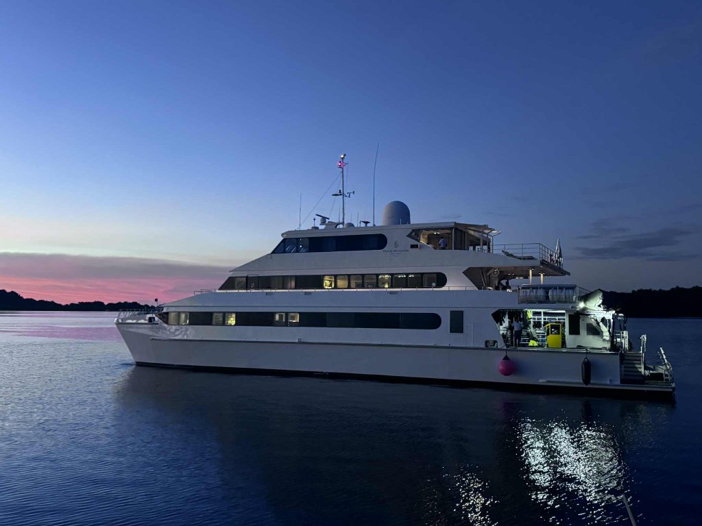 世界各地にハイエンドのホテルを展開する《フォーシーズンズホテル》が所有するラグジュアリークルーザー《Four Seasons Explore》に乗船!船は3階建てになっており、1階には全11部屋の船室。2階には冷房が効いたダイニングルームやラウンジ。3階デッキではトリートメントを受けることができるスパエリアもあります。お部屋は、クルーザーということを考えれば十分な広さ。クイーンサイズベッドにバスルーム、ソファとテーブル、ミニバーもあり、大変快適です。乗下船の送迎も、パラオ各所、そしてフライト時刻に合わせてフレキシブルに対応するというサービスの良さ。私の場合は、最初の3泊したホテルのチェックアウト時間に合わせて車で迎えきてもらい、港からモーターボートに乗り換え、沖に停泊しているエクスプローラー号に乗船しました。