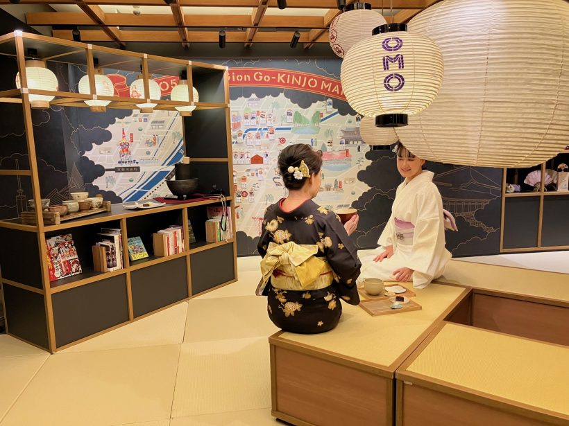 「OMO5京都祇園」の1階にあるOMOベースには、トップ画像のように夜7時半になると江戸時代創業の老舗商店による大きな提灯が灯り、お座敷のような畳スペースが出現。花街の雰囲気に包まれた「祇園宵のおも茶話会」が始まります。