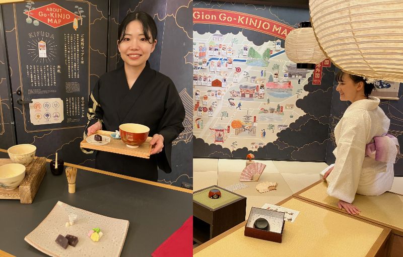 まずは茶話会らしく、創業300年の「鍵善良房」の和菓子を選び。OMOレンジャーさんが目の前で点ててくれる老舗「祇園辻利」の抹茶と共に味わいます。
