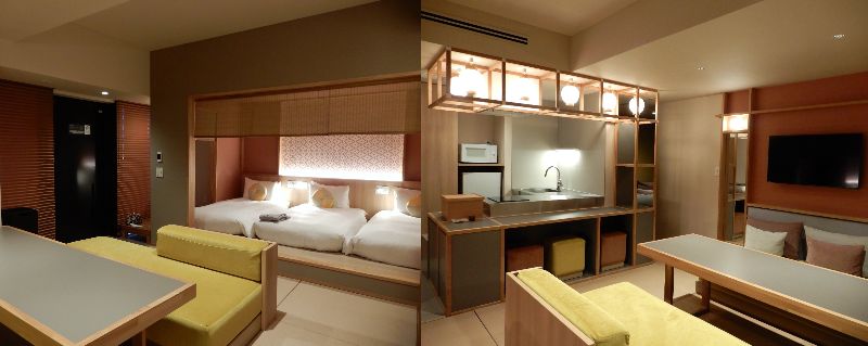 「OMO5京都祇園」 の客室は、ひとり旅から最大6名でも泊まれる部屋まで8タイプ。全室にゆったりしたバスタブがあってゆっくりできます。「茶の間」タイプの部屋には、寝室にリビングそしてキッチンまで。