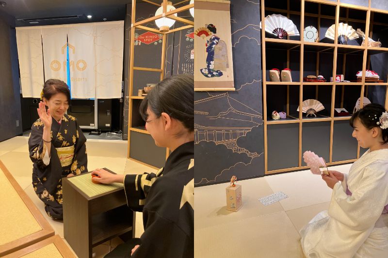 また、舞妓さんの名刺がわり「千社札」作りセットもあって、旅の思い出に自分の千社札を作ることも!かんざしや京舞扇子などが置かれたOMOベースで、花街気分で遊べました。