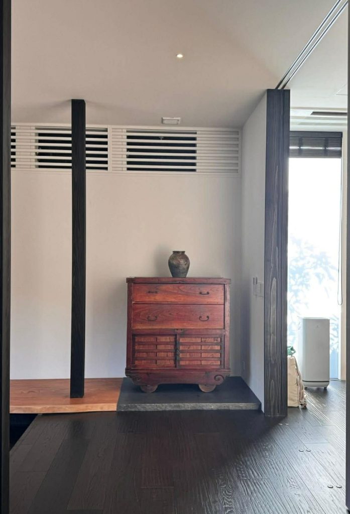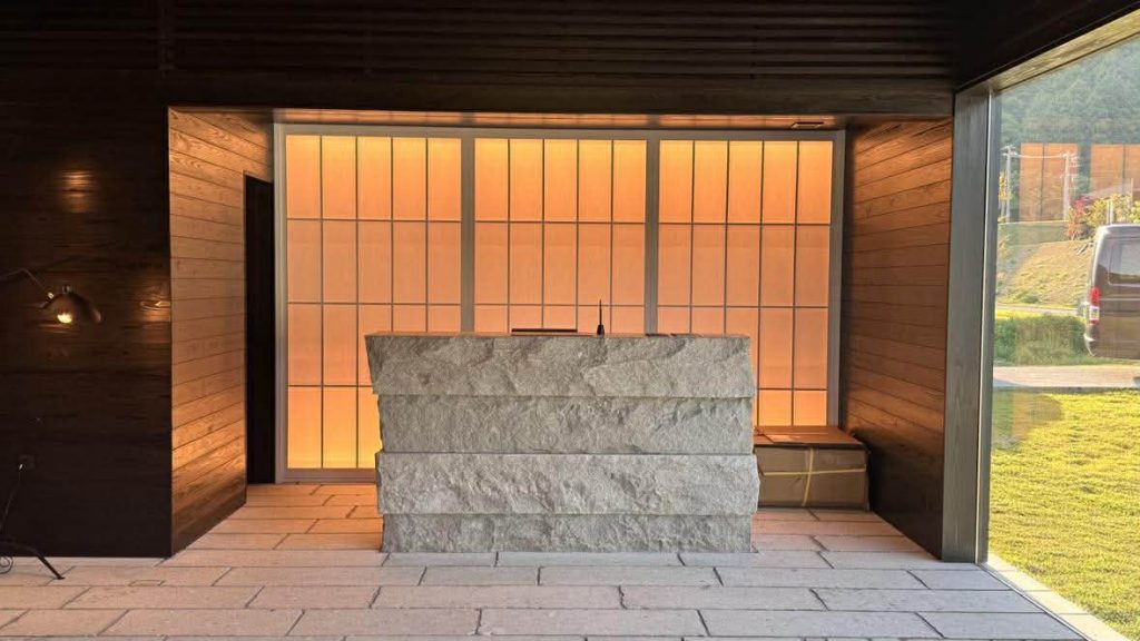 福井県永平寺町にある《歓宿縁 ESHIKOTO》。その意味は、「めったにないこのご縁を歓ぶ」という意味の仏教用語から由来しています。福井県を代表する、創業220年の酒蔵《黒龍酒造》の親会社が手がけた《ESHIKOTO》という複合商業施設と同じ敷地内にあります。福井駅から車で20分ほどですから、レンタカーをしなくてもタクシーで行けますね。フロント棟に立ち寄ると、宿泊するヴィラでチェックイン手続きができるとのこと。そのままヴィラへ向かいます。