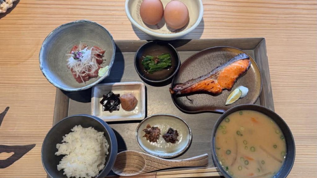 寝心地の良いベッドでぐっすり眠った翌朝。朝食は同じ敷地内の《ESHIKOTO》にあるレストラン《acoya》でいただきます。車で送迎してもらえるのですが、散歩がてら歩いていきました。九頭竜川がよく見えるテーブルにつくと、トレーに載せられた朝食が運ばれてきました。土鍋で炊いた大野市のコシヒカリ、福井市内の養鶏場の平飼い卵、黒龍酒造の酒粕入りの粕汁、池田町のクレソンのお浸しなど、福井県内の美味しいものがたくさん。珍味の「へしこ」のふりかけも添えてあり、ご飯のお供に最高です。