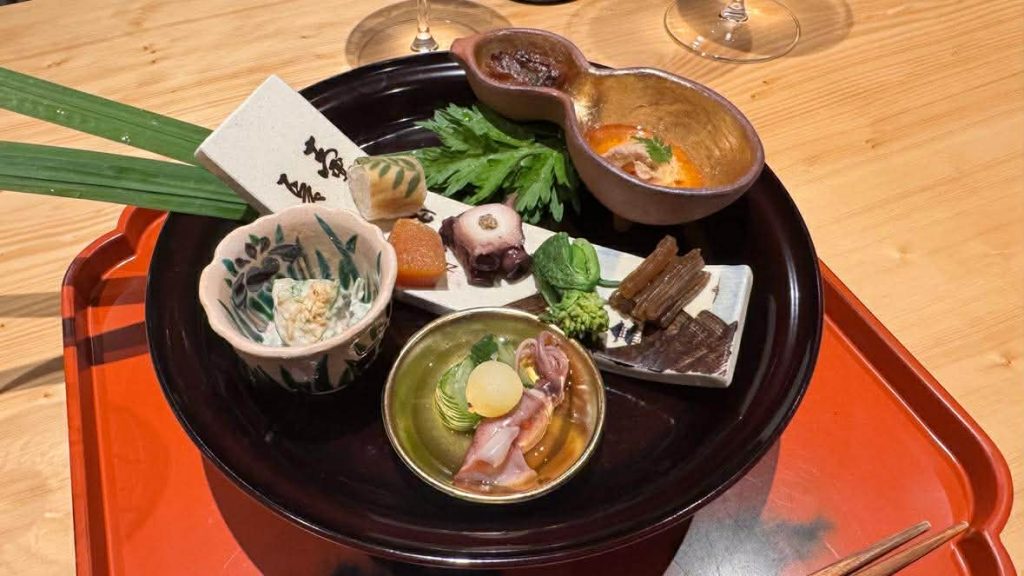 私が伺った日は日本料理「えん」の営業日。北前船が寄港した福井は昆布を使うお料理がたくさん。お出汁をとるだけでなく、昆布で包むお料理など珍しいものも。八寸も、お酒のおつまみになるものばかり。黒龍酒造の、ここでしかいただけない限定酒がいくつも出してくださるのが、嬉しい。夏は九頭竜川であがる鮎、冬は日本海のカニと、四季折々豊な食材を楽しめます。