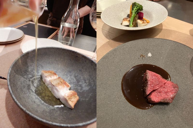 もちろんそれぞれにお酒のおすすめも抜かりなし。魚はフレッシュなアリゴテの白、肉はエレガントなピノ・ノワールでうまみを味わいました。