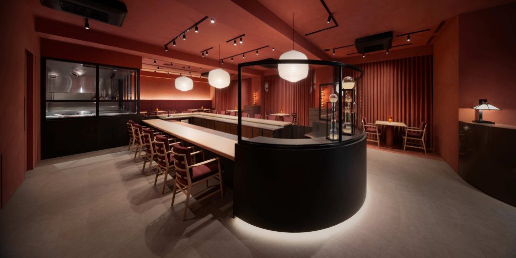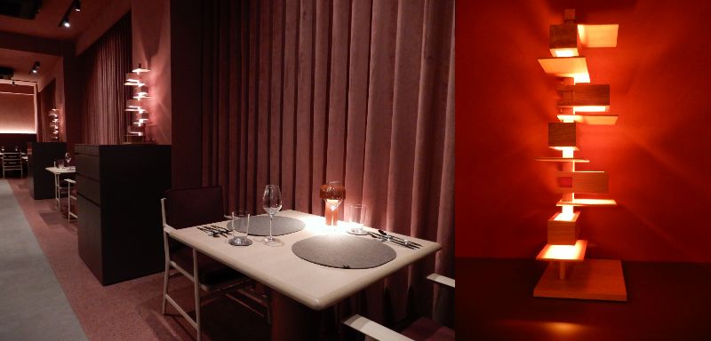 新進気鋭の創り手たちのステージのインテリアは、デザインオフィス「nendo」(代表 佐藤オオキ氏)によるものです。絶妙なラズベリーピンクの色合い、水引のようなタッセルや提灯、畳モジュールのタイル、フランク・ロイド・ライトのランプ(右)など、料理同様に和と洋の両方のバランスが見事。