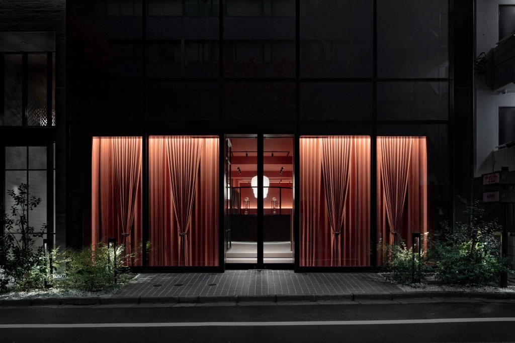 ラズベリーピンクのビロードのようなカーテンが、隠れ家的でもあり、その向こうに見える、出汁をハーブを通して抽出するウォータードリッパーが新しさを期待させます。