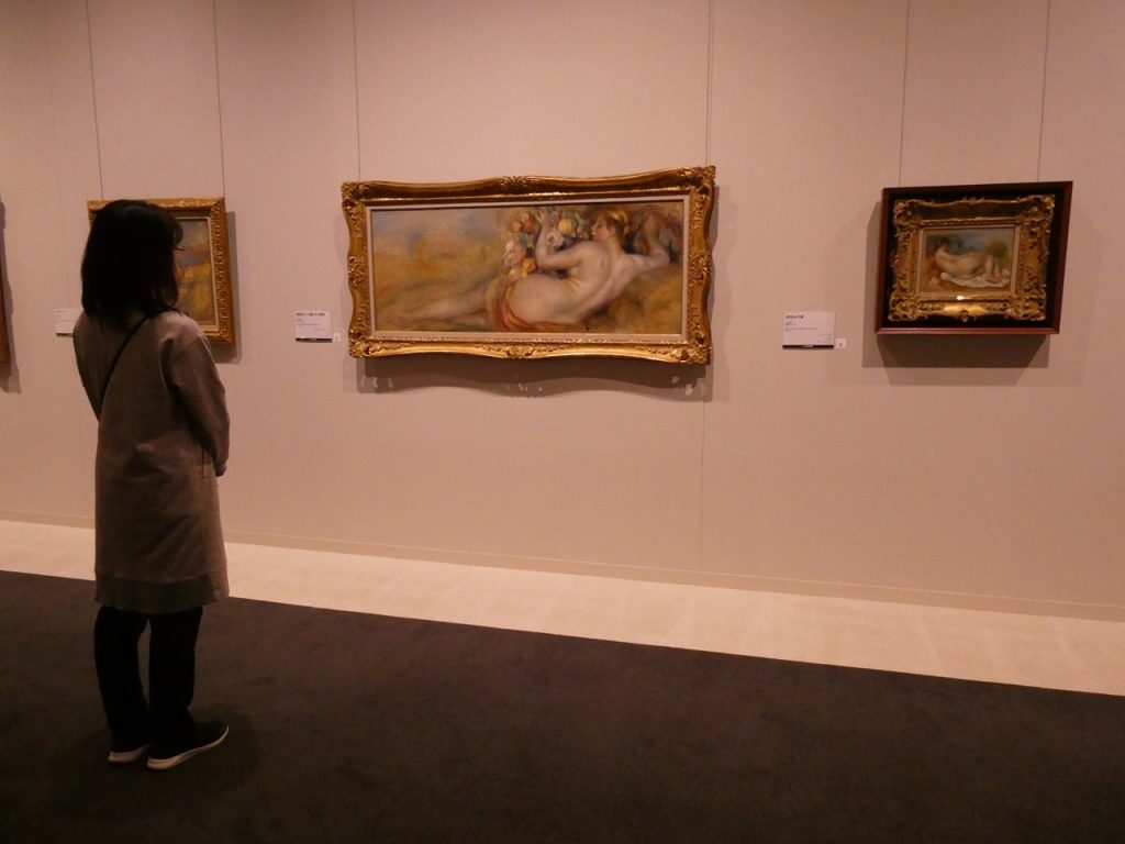 印象派時代の女性像から、「印象主義の行き詰まり」を感じ古典へと回帰したアングル様式時代、色彩に白を混ぜ真珠色の輝きをもたせた文字通りの真珠色の時代、骨折を機に慢性関節リウマチを発症後、南仏に転地療養し「自然のなかの裸婦」という伝統的なテーマに取り組み始めた時代、そして晩年に開花する豊潤な色彩による作品群へと様々に変化するテーマや筆致を年代ごとに追うことができます。