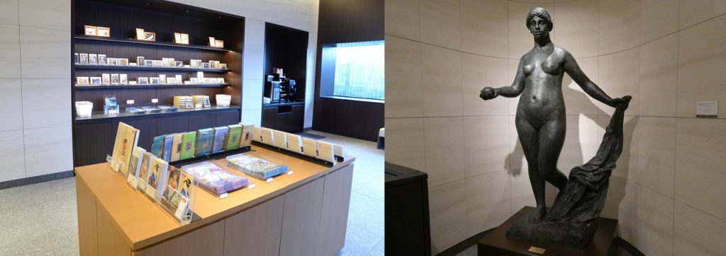 ミュージアムショップでは寛ぎながら展覧会の絵はがきやチケットフォルダーなどが選べます。ルノワールの彫刻作品の展示もありますよ。